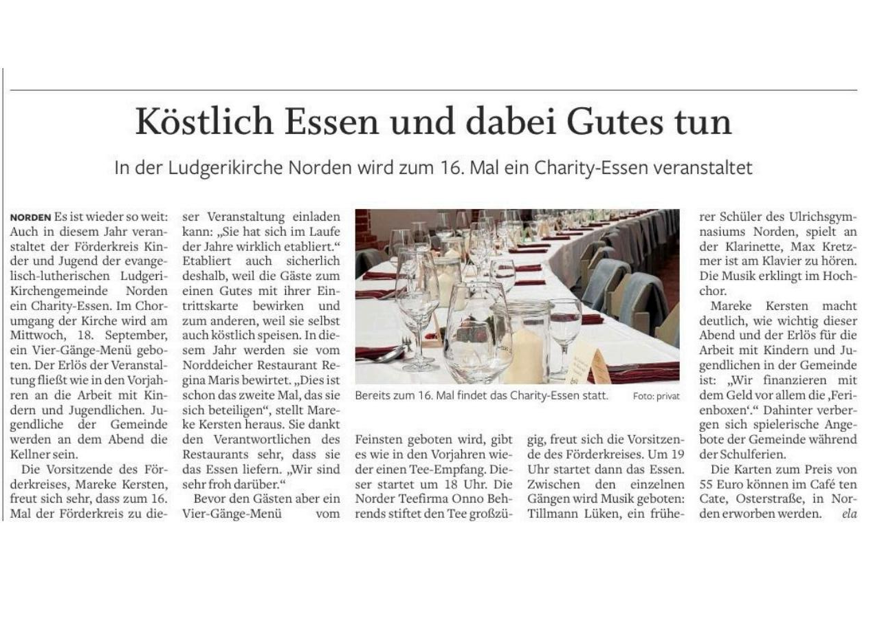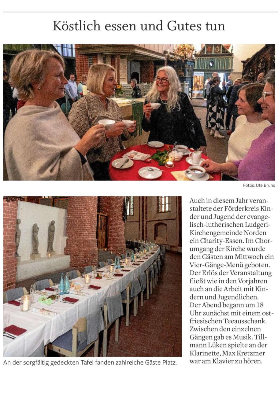 Man nehme: Eine ungewöhnliche Location wie die Ludgerikirche, Norder Gastronomen, die ein tolles Vier-Gänge-Menü auftischen, 13 gut gelaunte Jugendliche für den Service, drei Schwestern, die zauberhafte Musik machen und engagierte Gastgeber wie den Vorstand des Förderkreises „Kinder&Jugend“ – das vor 14 Jahren entwickelte und niemals veränderte Konzept für das Charity-Essen in der Ludgerikirche funktionierte auch am 20. September 2019 wieder. 54 Menschen nehmen an der langen, mit weißen Tischläufern, Kerzen und Blumenschmuck festlich dekorierten Tafel im Hochchor Platz. Neulinge sind ebenso dabei wie Stammgäste, die noch nie ein Essen verpasst haben. Und alle gehen beschwingt, entspannt und sehr zufrieden vier Stunden später nach Hause.