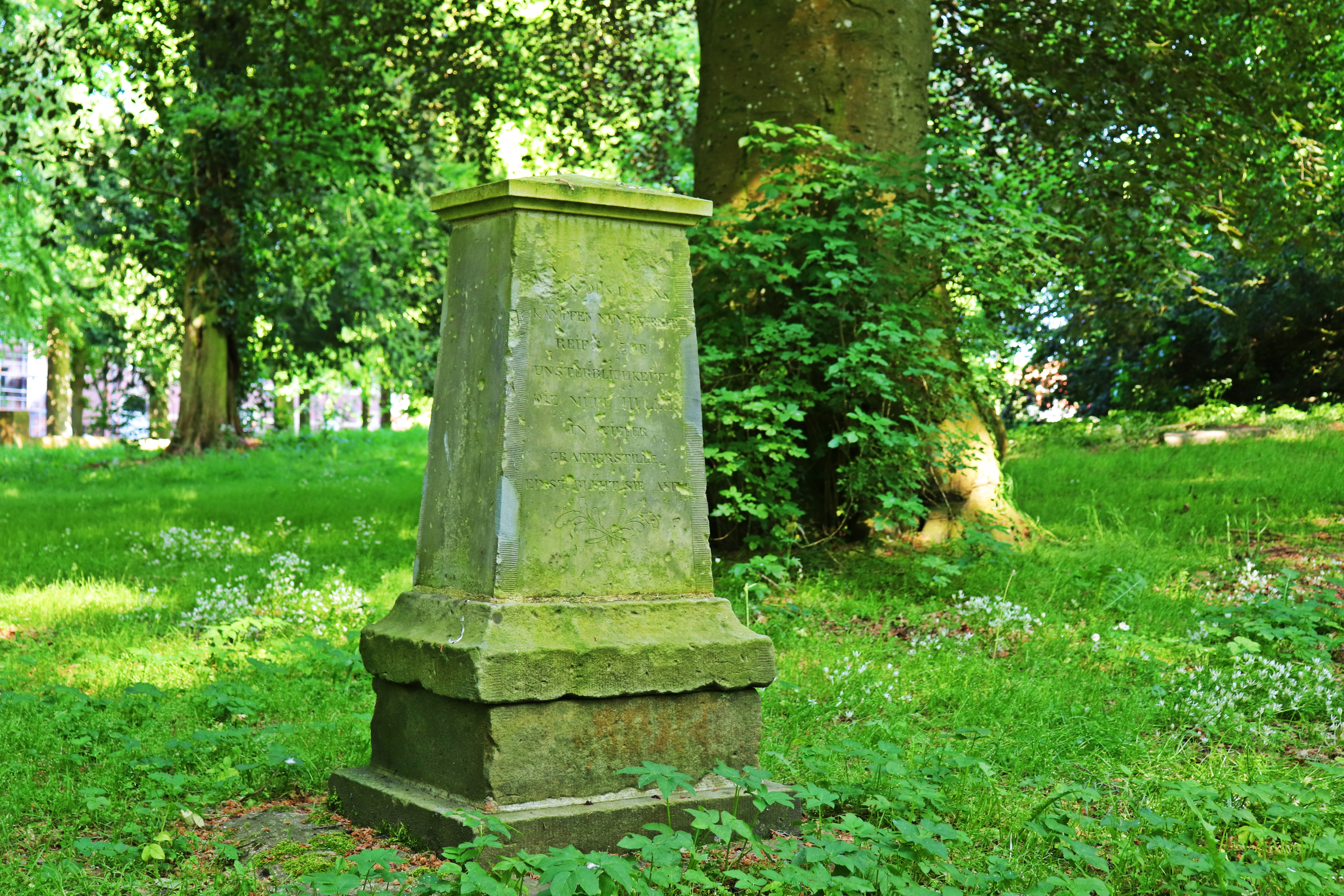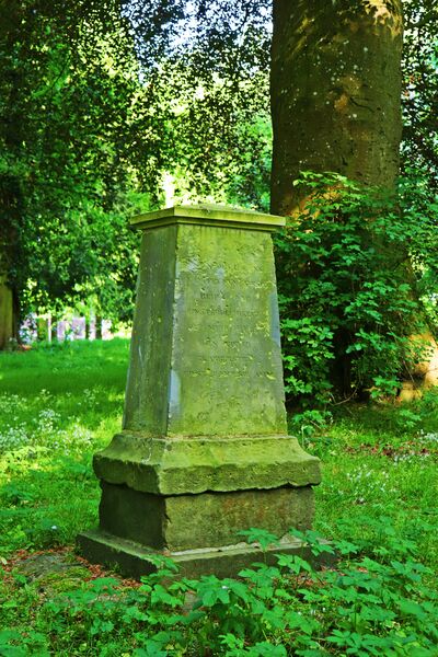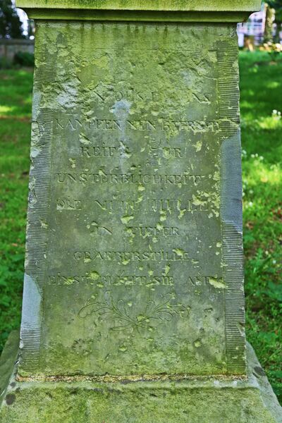 Der Text ist ein Gedicht: „Von des Lebens Kampf befreit / Reif zur Unsterblichkeit / Die müde Hülle / in tiefer Grabesstille / Einst blüht sie auf.“ Auf der anderen Seite steht: „Zum bleibenden Andenken An die / Verwittw. C.M.Duis geb. Hölscher / Sie starb im 40ten Lebensjahre / Am 11. Januar 1833 / Bruder und Schwester segnen ihre Gruft.“
