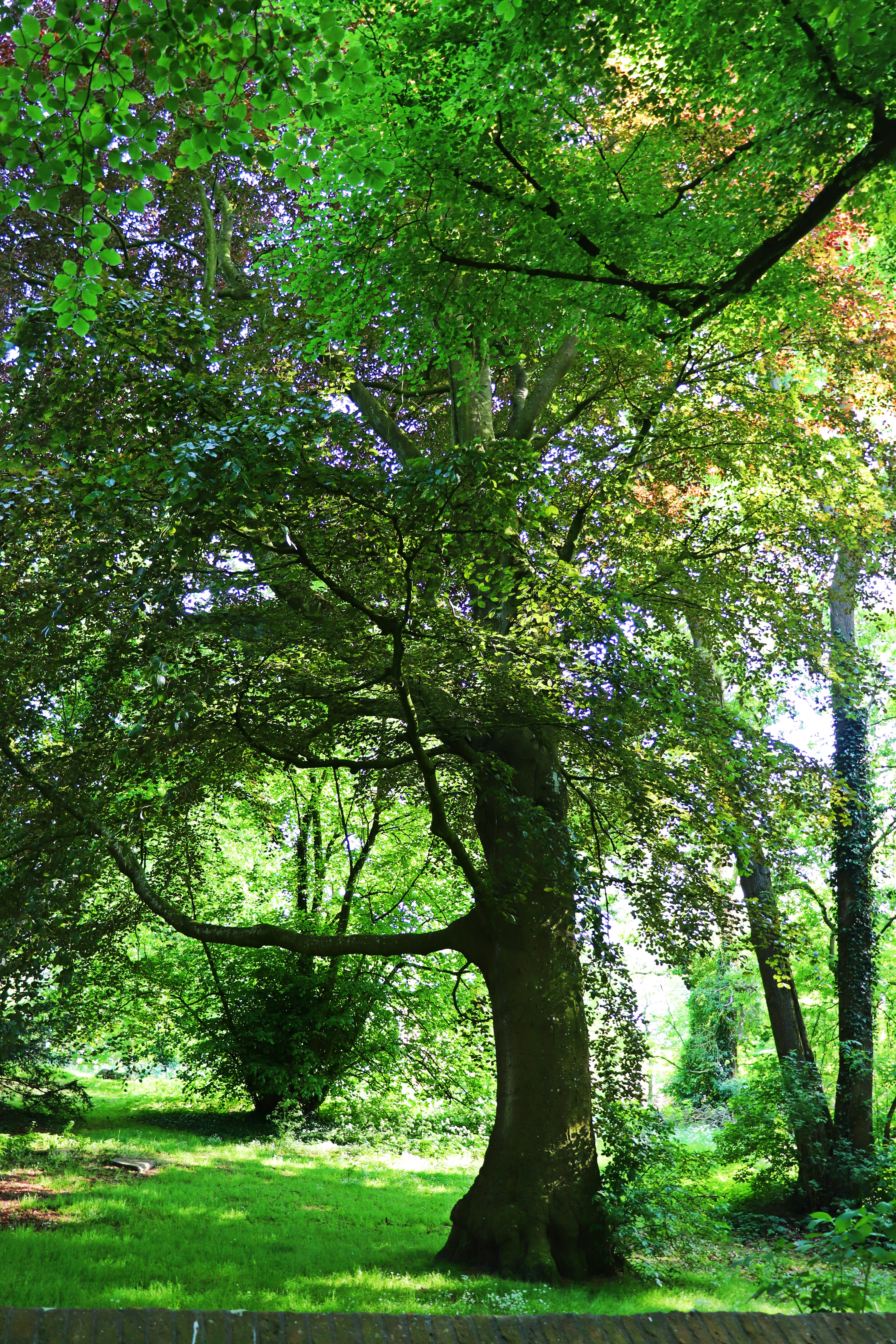 Fagus sylvatica pupurea –bis zu 30m hoch: Die Blutbuche, auch unter dem Namen Purpurbuche bekannt, gehört wie die klassische Rotbuche (Fagus sylvatica) zur Familie der Buchengewächse. Sie ist eine natürliche Mutation und wurde im 15. Jahrhundert entdeckt. Ihren Namen erhielt die Blutbuche wegen ihrer rötlichen Blätter. Die jungen Frühjahrstriebe leuchten kupferfarben, später in der Vegetationsphase glänzen sie in einem dunklen Bordeaux bis Schwarzrot. Die Blätterfärbung ist auf das Fehlen eines Enzyms zurückzuführen. Wie die klassische Rotbuche fühlt sie sich in feuchten und kühlen Gegenden Europas heimisch. Blutbuchen können bis zu 300 Jahre alt werden, vorzugsweise werden sie als Einzelexemplare an zentralen Stellen in Städten gepflanzt. Wie hier vor Ihnen findet man sie aber auch auf alten Friedhöfen. Der sichtbare Wurzelansatz dieses Baumes ist vermutlich auf eine Hangerosion zurückzuführen. Das Alter des Baumes dürfte bei ca. 150 Jahre liegen.