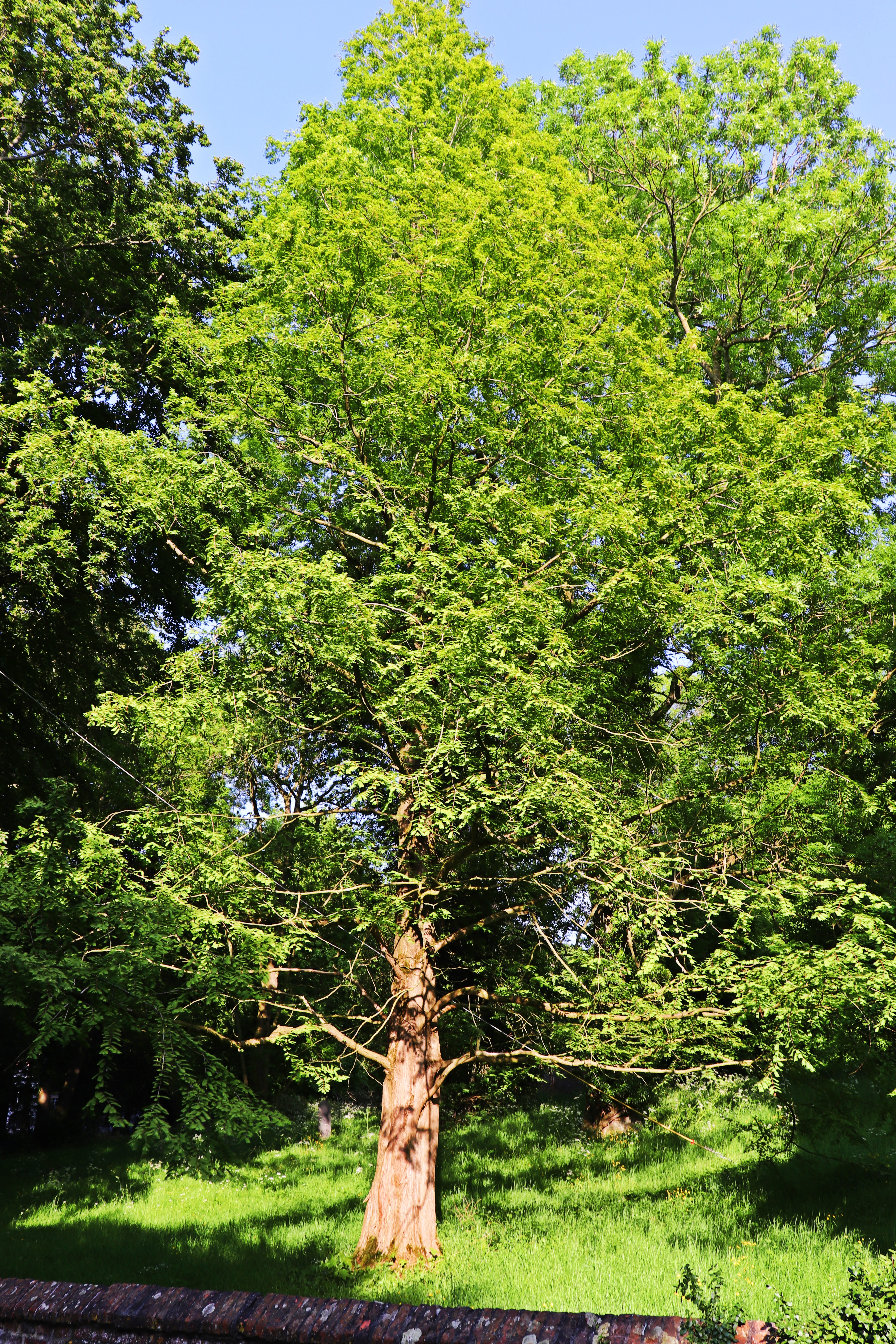 Metasequoria glyptostroboides – wird bis zu 80 Meter hoch. Den Urweltmammutbaum trifft man häufig in großen Parks oder öffentlichen Gartenanlagen an. Der Baum stammt ursprünglich aus China oder dem Westen Amerikas, wo er vermutlich schon zu Lebzeiten der Saurier existierte. Obwohl er Wärme liebt, hat er sich dem feuchten und kühlen Klima Europas erstaunlich gut angepasst. Da er bei entsprechendem Alter große Mengen C02 speichern kann, gilt er für die Wirtschaft und Stadtplaner u.a. als Zukunftsbaum. Die wunderschöne rötliche Rinde und die feinen beinahe blätterähnlichen Nadeln machen den Mammutbaum zu einem Unikat in der Pflanzenwelt. Wie die Lärche verliert der Mammutbaum im späten Herbst seine Nadeln. Der vor Ihnen stehende Baum ist ca. 50 Jahre alt!