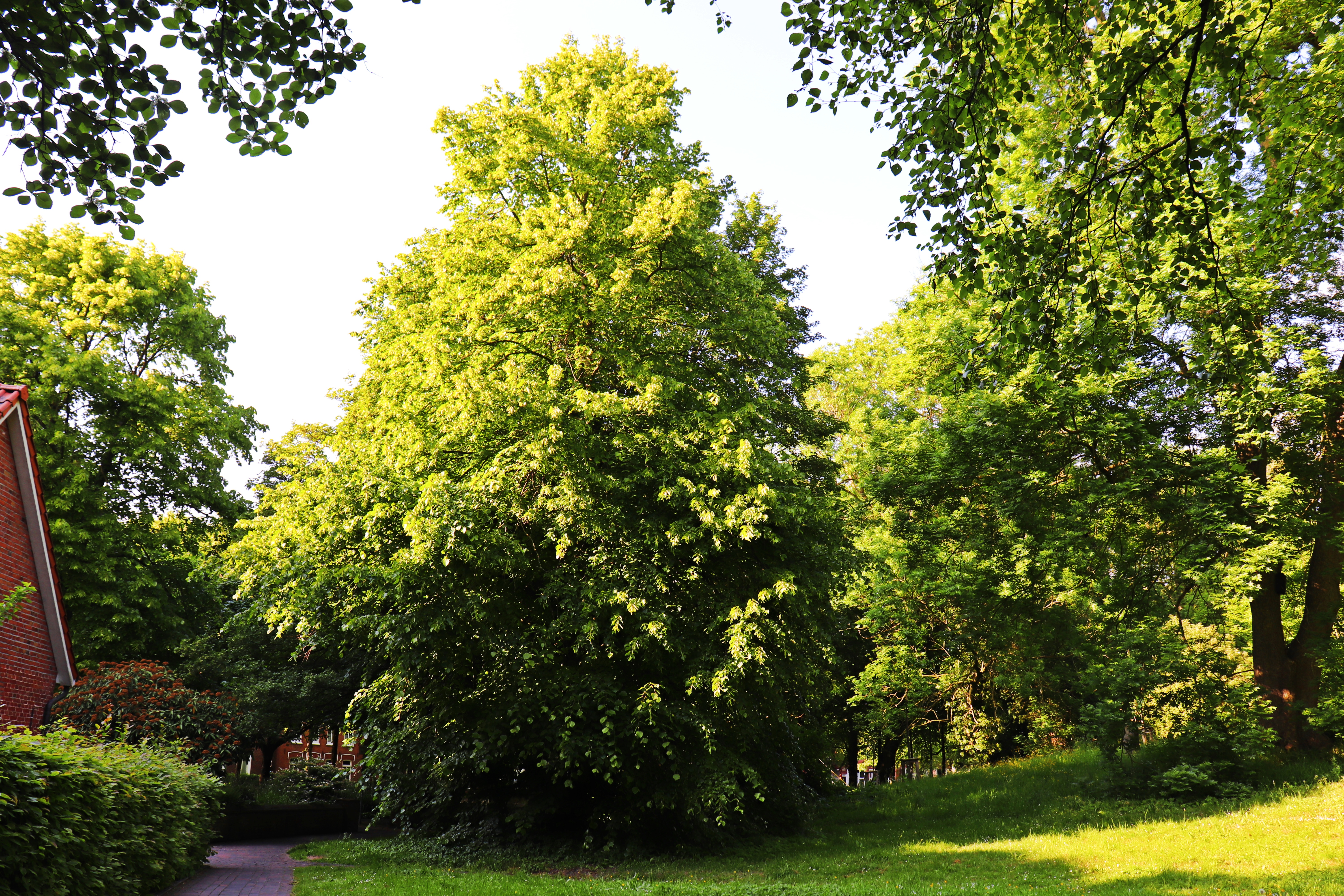 Tilia cordata – wird bis zu 35 Meter hoch: Winterlinden können bis zu 1000 Jahre alt werden und einen Stammdurchmesser von fast zwei Metern erreichen. In früheren Zeiten wurden Linden sehr häufig in der Mitte des Dorfes als Baum der Rast und Besinnung gepflanzt. Unter ihr spielten Kinder, versammelte sich die tanzlustige Jugend und Erwachsene führten unter ihr Gespräche über Dorfneuigkeiten und Politik. Bei den Germanen fand unter der Dorflinde das „Thing“ statt, d.h. die Volks- und Gerichtsbarkeiten. Auch in Liedern und Gedichten spiegelt sich das innige Verhältnis der Menschen zur Linde wider. Das sehr weiche Holz findet Verwendung bei der Herstellung von Gefäßen und Spielwaren. Es liefert zudem vorzügliches Furnier. Weil im Mittelalter viele Künstler aus dem Holz der Linde Christus am Kreuz, Maria und die Apostel schnitzten, wurde dem Holz der Name „Lignum sacrum“ gegeben. Aus den Blüten wurde und wird Lindenblütentee als schweißtreibendes und fiebersenkendes Heilmittel bei Erkältung und Grippe hergestellt. Die Linde gilt als typischer Stadtbaum und wird auch bei uns als Straßenalleebaum gepflanzt.