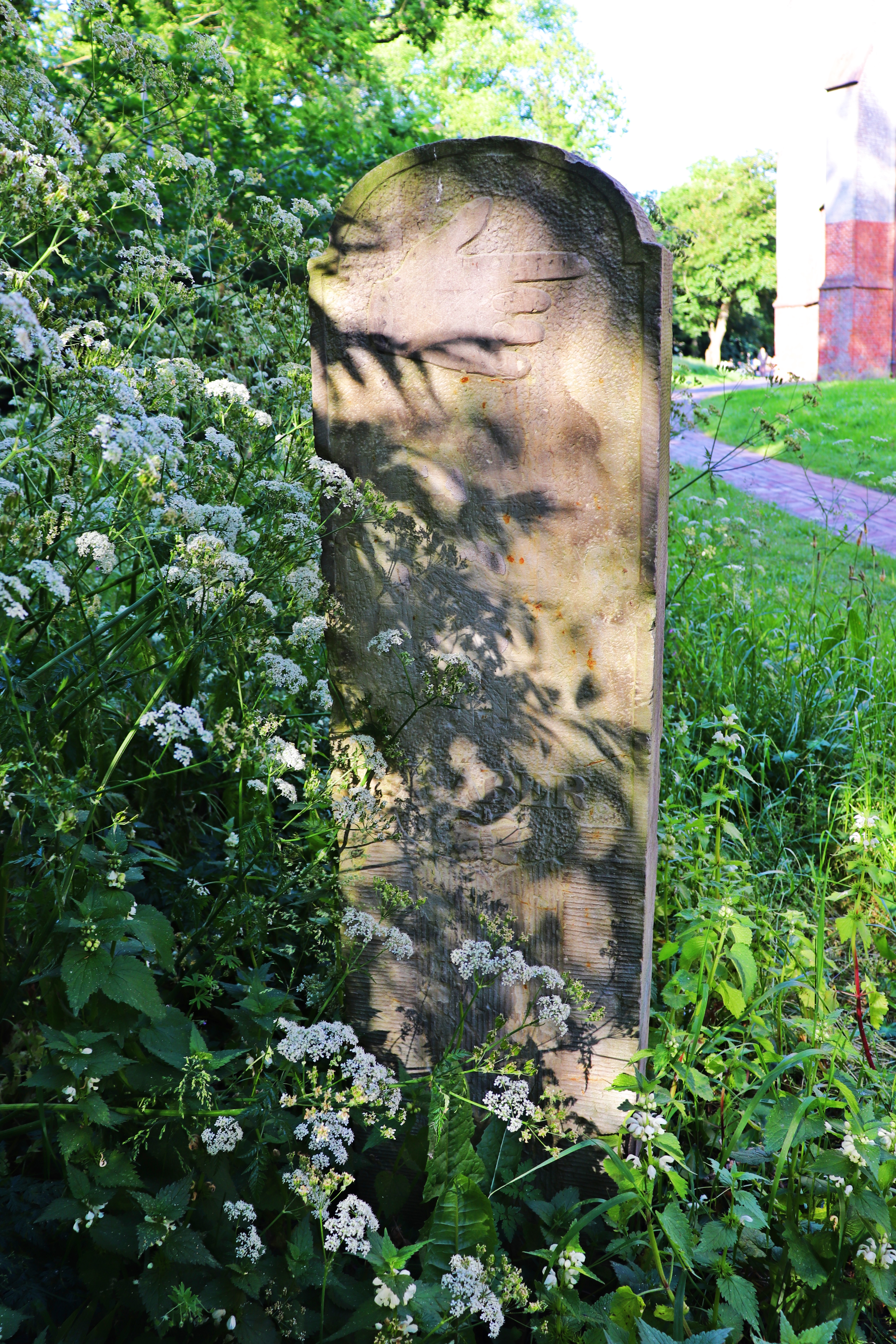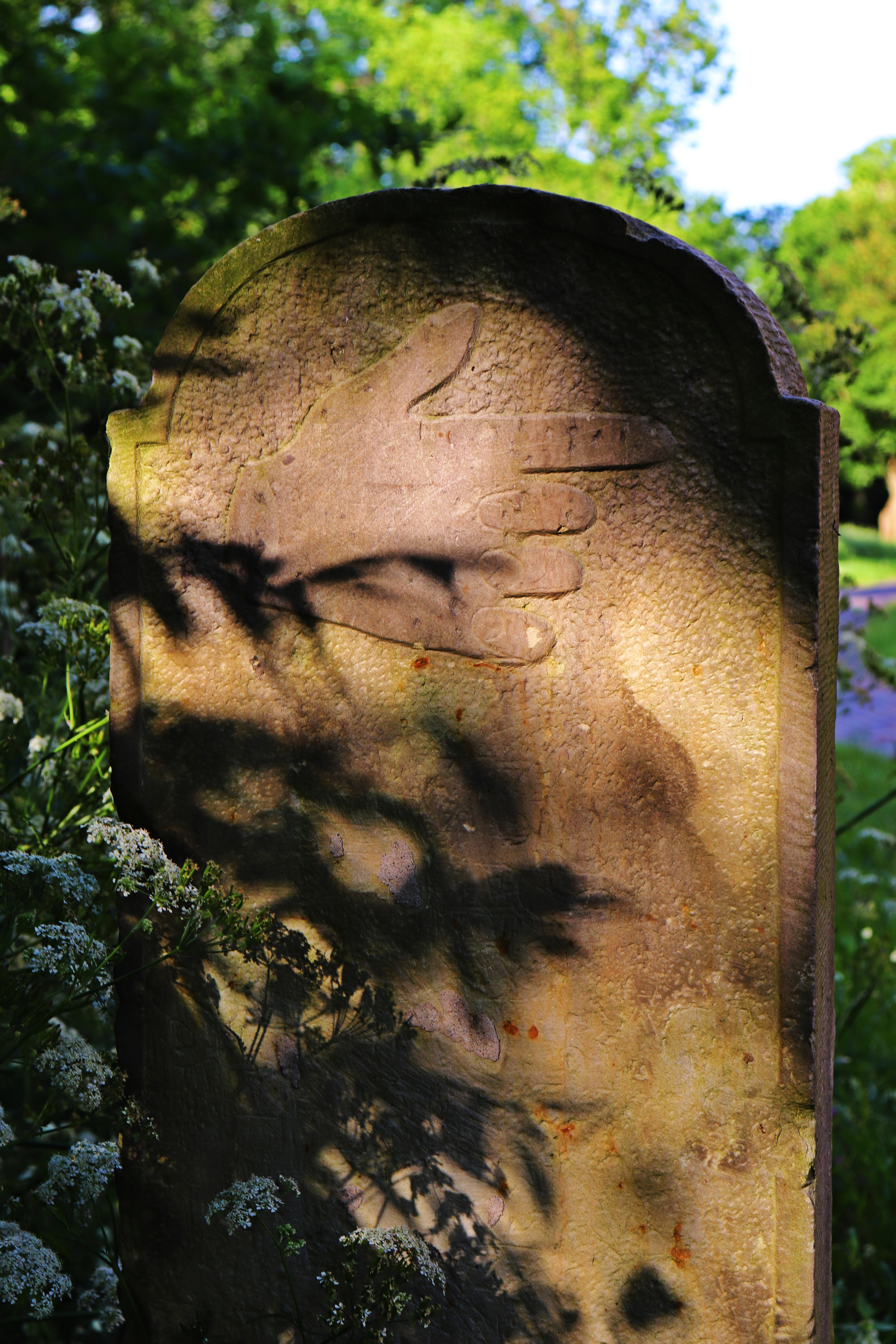 Auf dieser Stele ist der Name des Besitzers nicht mehr lesbar. Die abgebildete Hand zeigt nach rechts, wo weitere Gräber der Familie liegen, oft wird auch die Anzahl der Grabstellen noch angegeben. Stelen zeigen nur einen Besitzanspruch an und meistens keine weiteren persönlichen Daten. Hier ist noch ein Schmetterling zu erkennen. Diese Stele steht sicherlich nicht mehr an ihrem ursprünglichen Platz, denn die Hände oder Pfeile aller anderen Stelen zeigen immer nach Norden und sind von Osten zu lesen.