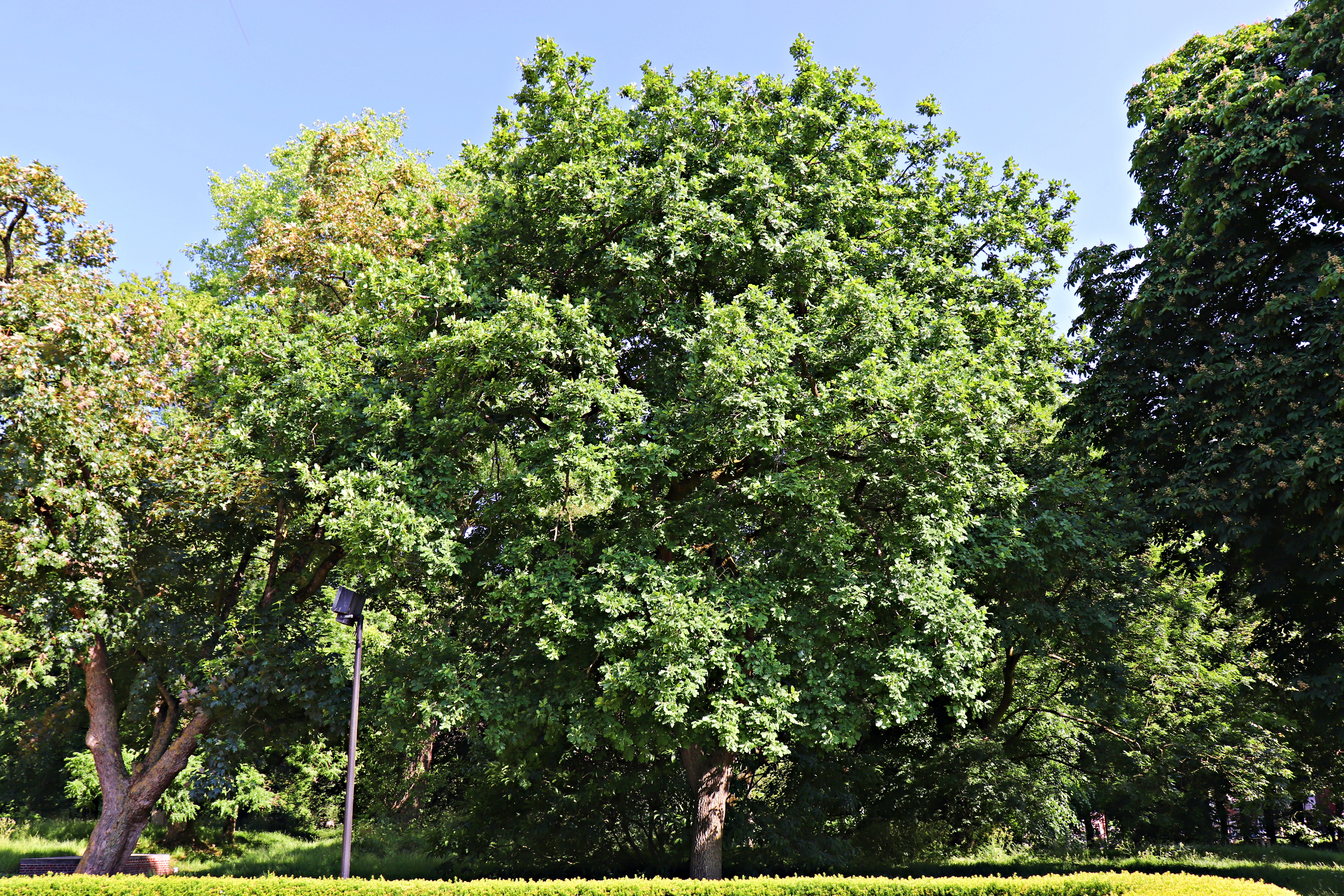 Quercus robur – wird bis zu 40 Meter hoch. Die Stieleiche ist von den europäischen Eichen am weitesten verbreitet. Ihr wertvolles Holz wurde früher wegen der besonderen Härte und Widerstandsfähigkeit im Schiffsbau verwendet. Heute dient das Holz überwiegend der Möbelherstellung und überall dort, wo hartes und witterungsbeständiges Material erforderlich ist. Die Eiche zählt zu den ältesten Baumarten, schon vor über 3000 Jahren wurde der größte Teil Europas von Eichen- und Buchenwäldern bedeckt. Schon sehr früh erkannten die Menschen den Nährwert der Eicheln als Mastfutter für die Schweine. Die Stieleiche kann 500 bis 1000 Jahre alt werden, ihre Standfestigkeit wird durch eine sehr tief in den Boden ragende Pfahlwurzel gewährleisten. Deswegen scheint sie auch für die Klimaveränderung gut gewappnet zu sein. Der Eiche wird in der Mythologie eine enge Beziehung zum Himmelsgott zugeschrieben. So war sie bei den Griechen dem Zeus, bei den Römern dem Jupiter und bei den Germanen dem Donner- und Gewittergott Donar geweiht. Im oberen Geäst dieser Eiche können Sie auf der Rückseite eine interessante Astverknüpfung erkennen.